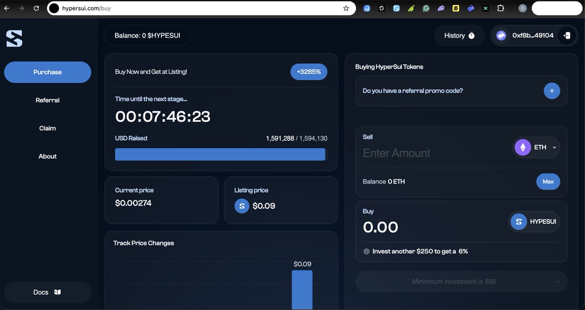 该项目目前正处于代币销售阶段, $HYPESUI 现价为0.00143美元,相较于计划上市价格0.09美元,存在超过3000%的潜在收益空间。