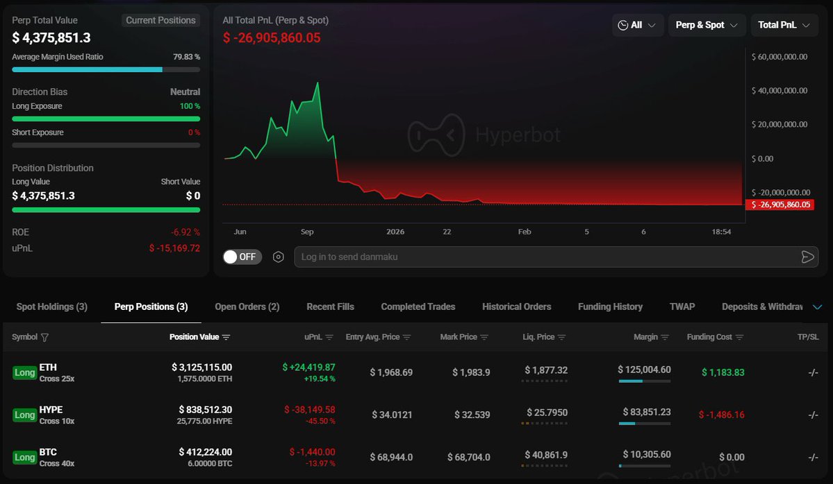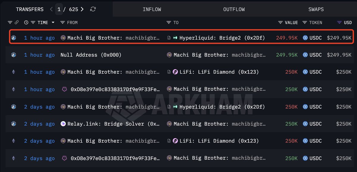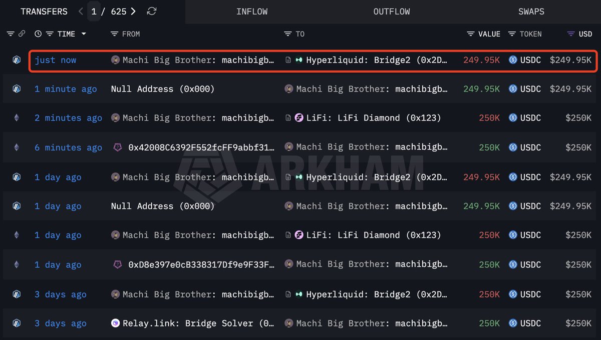随着市场持续下跌,麻吉大哥 @machibigbrother再次向 #HyperLiquid 存入25万美元 $USDC ),以增加并开设多头头寸: $ETH (25倍), $BTC (40倍), $HYPE (10x) ,和$PUMP (10x) 。