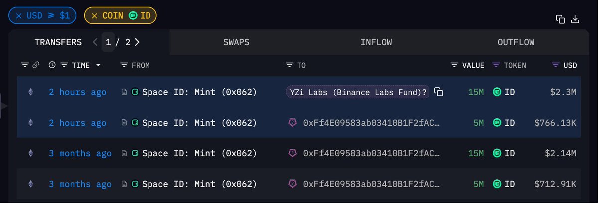 时隔三个月,Space ID 再次向 Yzi Labs 关联地址转移 2000 万枚 ID,价值 306.4 万美元