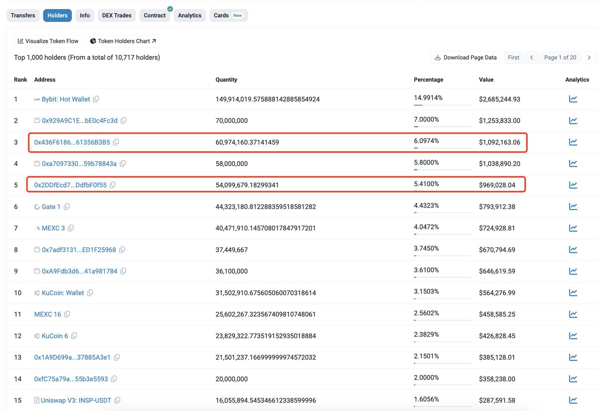 鲸鱼(0x436F和0x2DDF)保持累积$ INSP,目前持有1.0956亿美元的INSP(398万美元),占总供应量的10.96%。