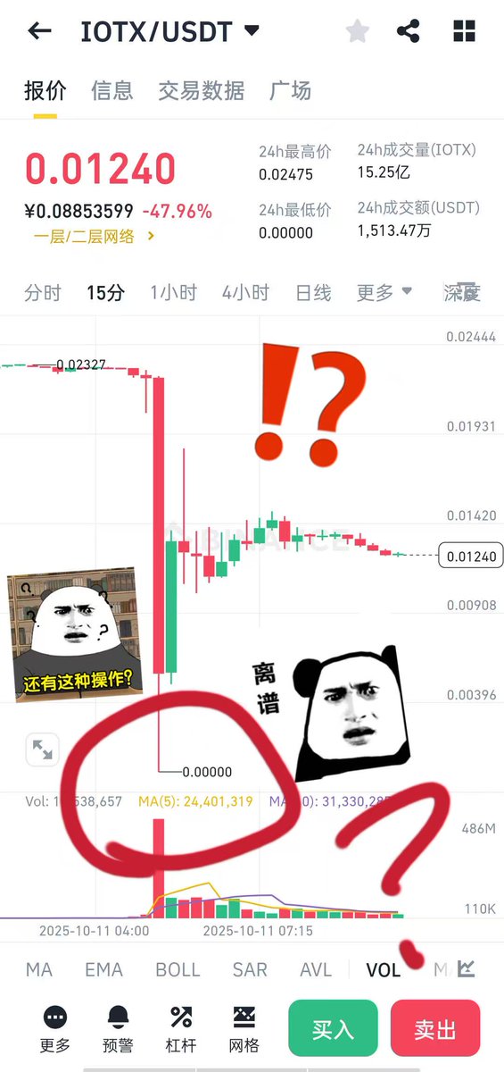 【本来应该从从容容游刃有余 现在是匆匆忙忙连滚带爬】 这波 $IOTX 直接“归零”插针,都懵了吧 一根针把盘口从天上插到地心,连K线都在问:“兄弟,这剧本谁写的?” 币圈的流动性游戏,有时候比行情还刺激—— 记得:别硬刚