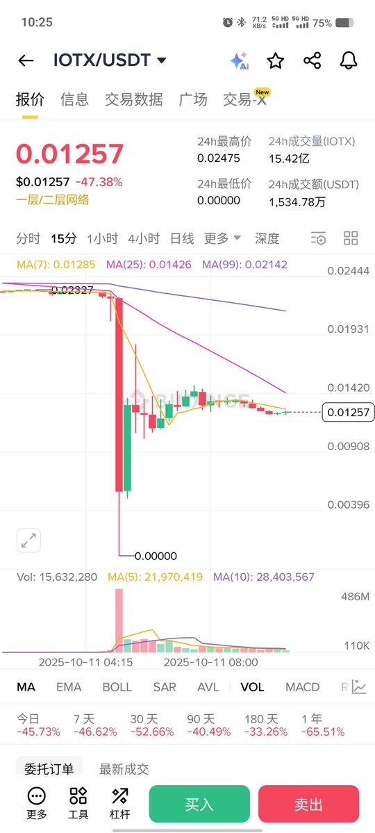 这根 $IOTX 的“跌到 0”K线真吓人,但其实多半是流动性被瞬间抽干造成的闪崩,不是真归零。 在这种行情下,深度差一点、有人砸市价单,就能把盘口打穿。 过去 24 小时全网爆仓 130 亿美金,弱币先死,一点不夸张。 这种行情就是在提醒我们:小币种别梭哈,更别开杠杆。 $IOTX