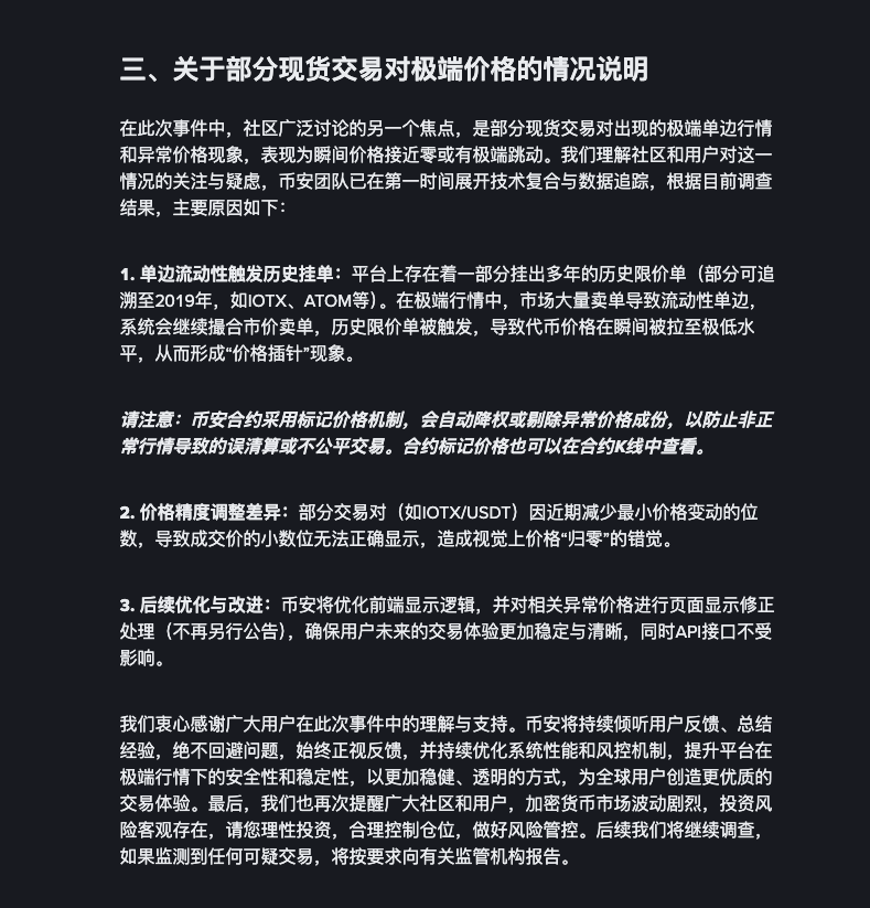 早些年2018年前,CEX里其实还是有不少的,行业早期么,老韭菜应该有印象,但过去几年的确没见过了。 我也有点纳闷为啥K线会被修改,去翻了一下币安的公告解释。怎么说呢,其实不管有再Solid的理由,在大家心理创伤未愈的时候做这些更改的确低估了对民意的刺激。 虽然我没有在清算中被重创,但换位思考能理解受到伤害的用户是什么感觉。 还不如改回去呢,当然除了个别明显有错误的(比如 $IOTX 0.0000 这种)。。。