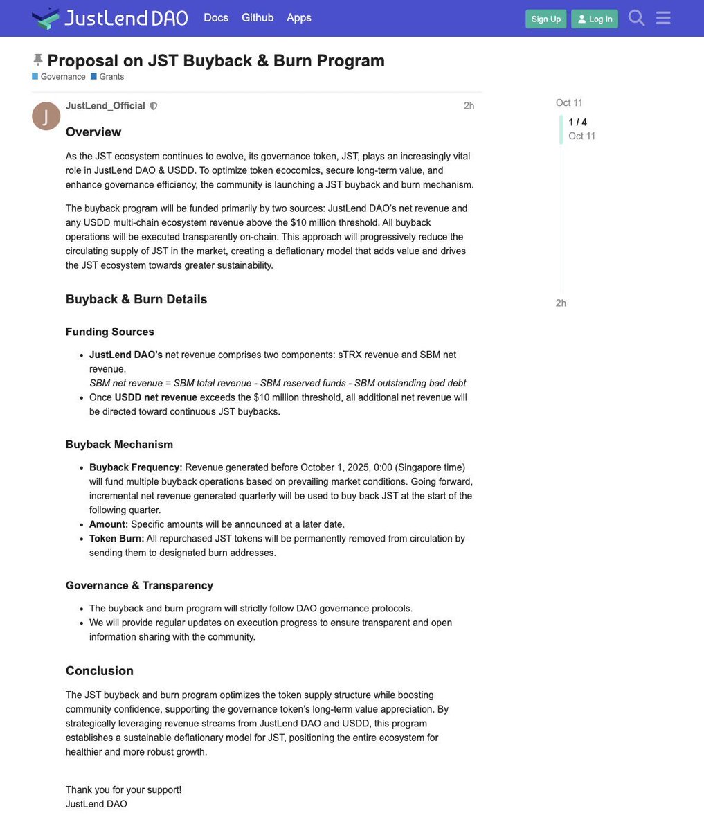 JST 回购销毁的论坛提案已经发布,核心思路是通过定期回购并销毁 JST,来提升代币的稀缺性与长期价值。这相当于为 JST 引入了一个持续的通缩机制,对持有者来说是明确的利好。回购资金来自协议收入,等于把生态收益直接反馈给代币持有人,长期看能进一步强化 JST 在 JustLend DAO 中的治理作用。