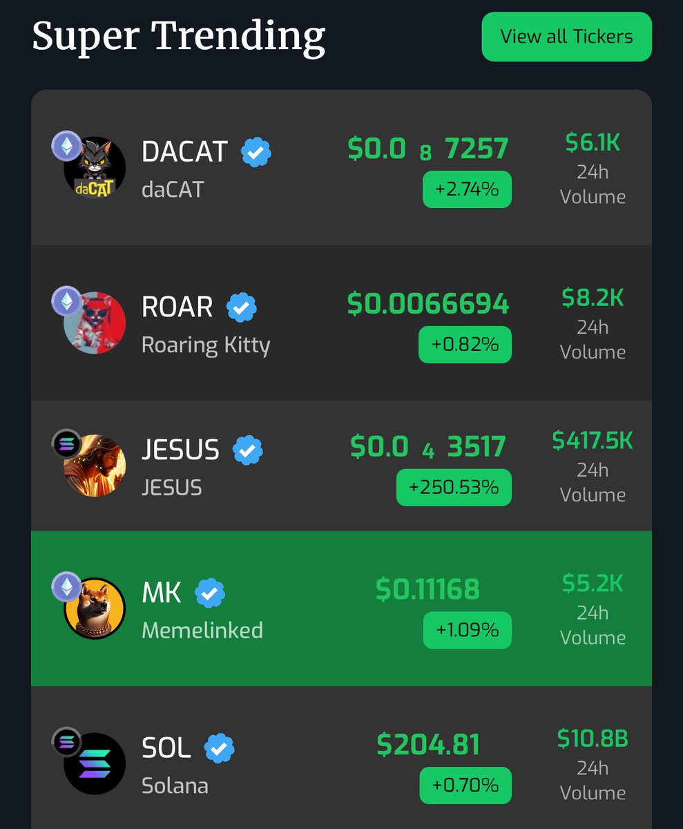 今天的前五名趋势令牌 今天列出2个SOL或.12 ETH的列表 @dacat_token @roaringkitty_22 $耶稣 @memelinked @Solana
