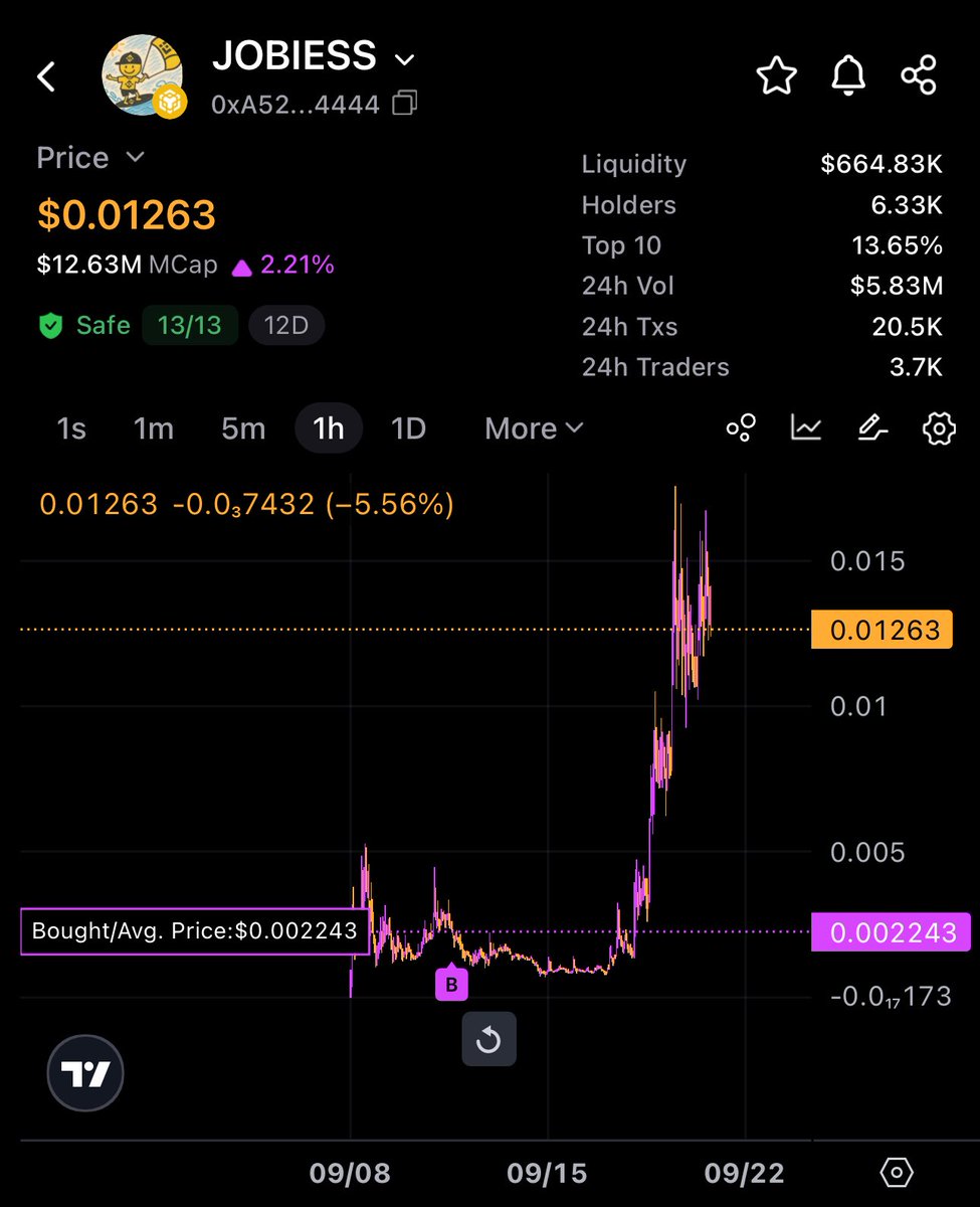 我也买了 $jobiess 因为其实就是失业的意思,这次大暴跌,包括我在内,很多人都亏麻了,反而更多人共识失业的这个meme了 0xa524b11473b7ce7eb1dc883a585e64471a734444