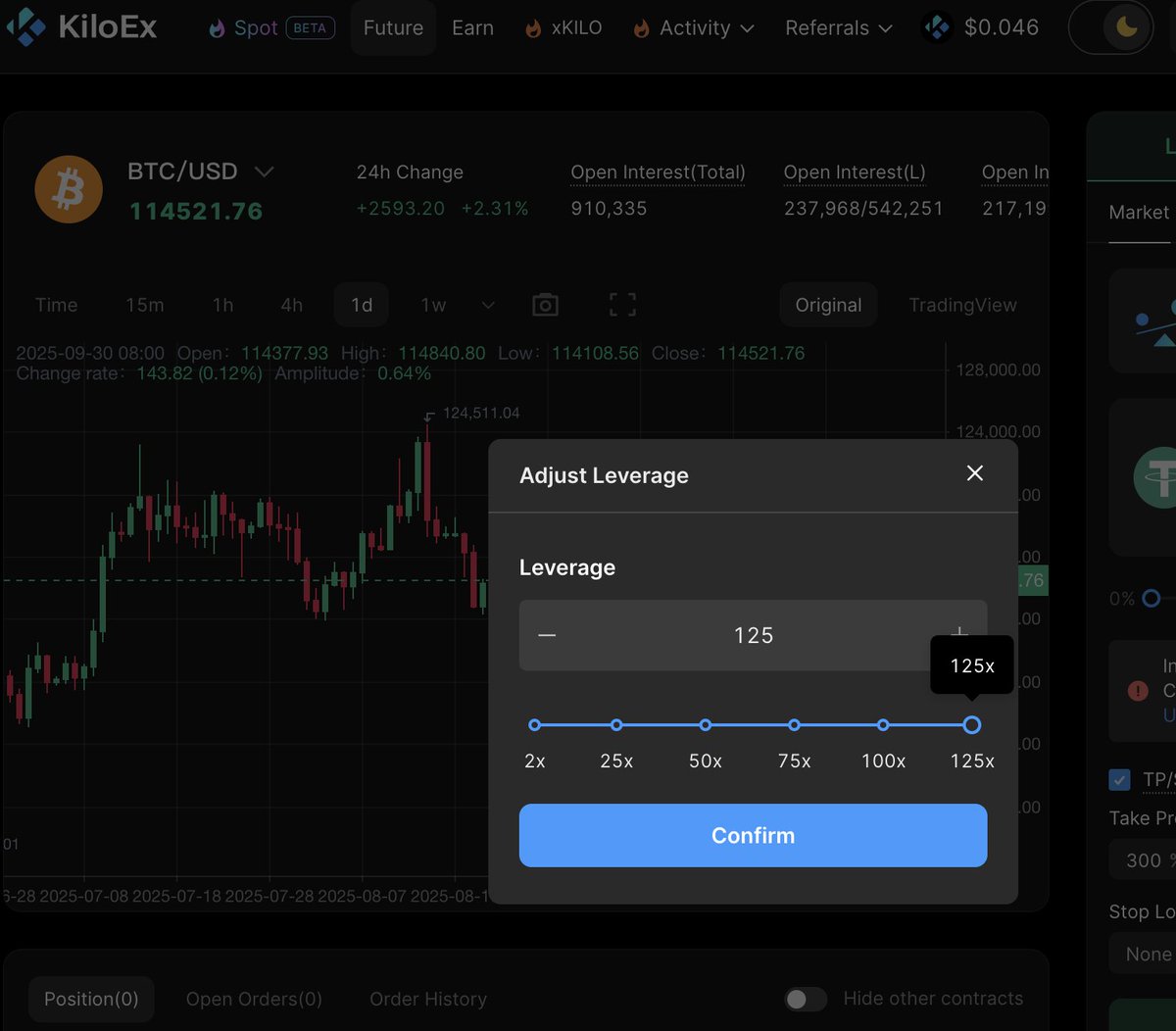 ☻现在还有一个新的合约活动上线,可瓜分 10 万枚 $Kilo ,按目前价格来算,活动奖励总额 3000U ,合约最高可以增加 125倍杠杆,BTC/ETH 0滑点,重点大家参与的时候一定要加好保证金,别爆仓了。