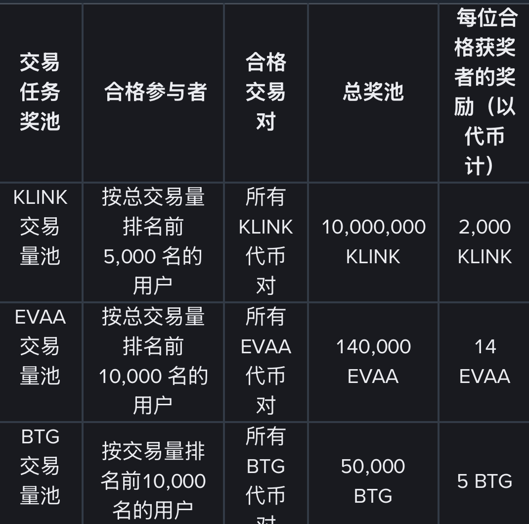 在币安 Alpha 的 BNB 智能链上交易 KLINK、EVAA、BTG,按各代币的累计交易量排名分奖
