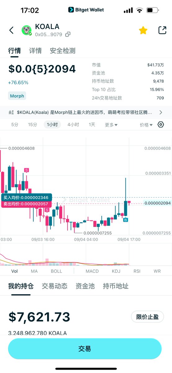 实名 明牌 买入8000U 3.2%M链考拉 $KOALA 0x051bc29e6d13671f6bcbd8be8bb7d889e0d89079 归0认了 我看不惯 MDOG的分流和阴谋 关于考拉不科普了 也没打算让你们现在买入 我也没法波段 我买入就30个滑点 现在卖出还要30个滑点 翻倍我都不赚钱 这个币是Morph链的第一个Meme 也是官方吉祥物 其他M开头的Meme最终都是投机 走不长远 只有原生Meme最终才能走的长远 我赌它会是最终跑出来的M链龙一