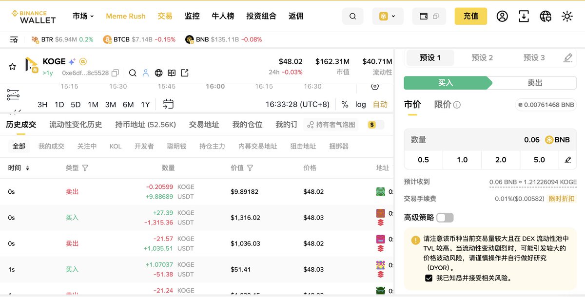 自从上次发过Alpha BSC链四倍交易量加成后,我自己也在测试! 我拿我的测试结果举例吧: 我是拿 $KOGE 测试的,主要是池子大,当然可以选择其他币种,这里不做建议!!! 我买的时候是直接用建议价格买的,具体操作请看视频!!中间脑子乱了一下耽误了些时间!! 实测下来买入2029.15U 卖出2028.93U 中间损耗很低!!! 我的建议还是小金额刷,哪怕多刷几次,大额还是容易怕滑点!!!
