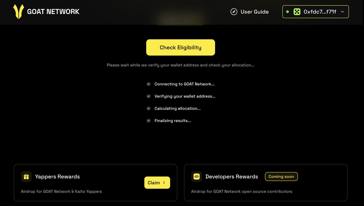 GOATED空投可以领了: alpha大概卖了 50u,交互跟嘴撸有空投的记得领 领取: