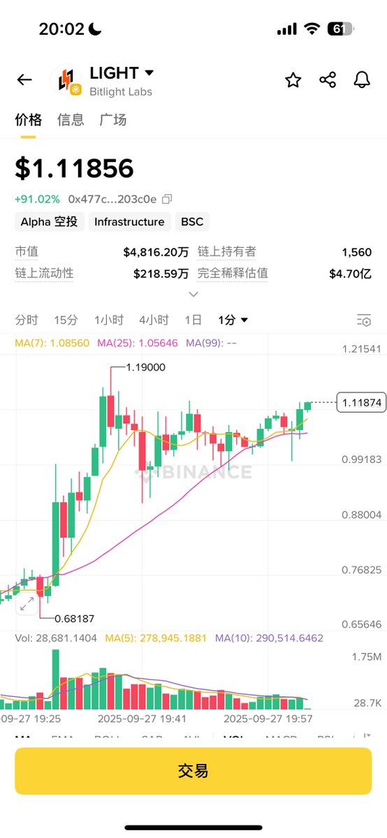 没人跟说 $LIGHT 是大毛啊? 今晚 190 分领取 150 枚 $LIGHT ,高点可以卖180u 低点跟高点也就30分钟时差,钻石手赢了 反倒社区打了 RGB 跟积分反撸了,交互过的都去查查吧 链接: