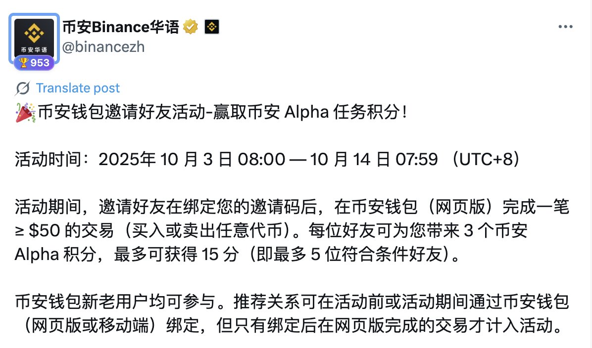 刷 alpha 副本任务来了: ——活动期间绑码后在网页端完成 ≥50u 交易,单个完成可以增加 3 分,最多15 分,注意下时间,14号 8 点截止 另外第一个加 5 分的活动明早 8 点结束,如果没做可以配合第 2 个活动最多领取 20 分,一定要在网页版交易! 邀请好友:https://t.co/tGp3diecm1 邀请码:CUJ6PBS3 如何找到自己的邀请码:币安钱包主页——邀请好友