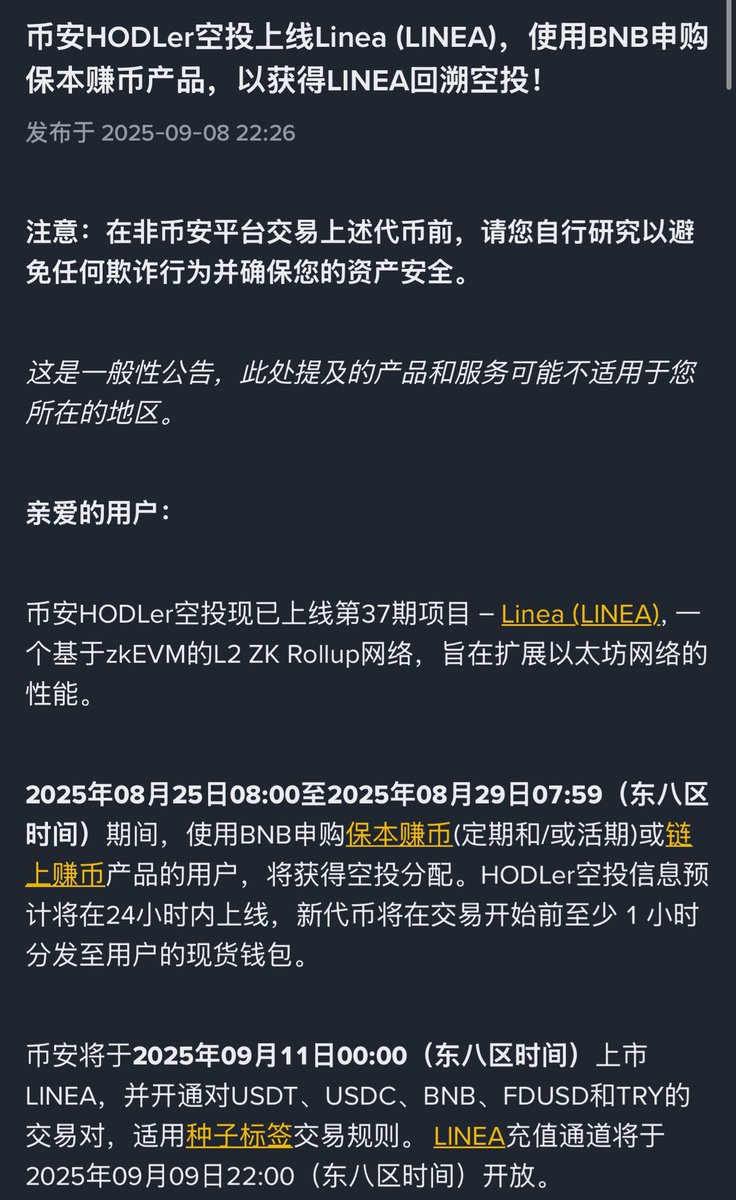 今天就来聊聊币安第 37 期 HODLer 空投项目—— $LINEA