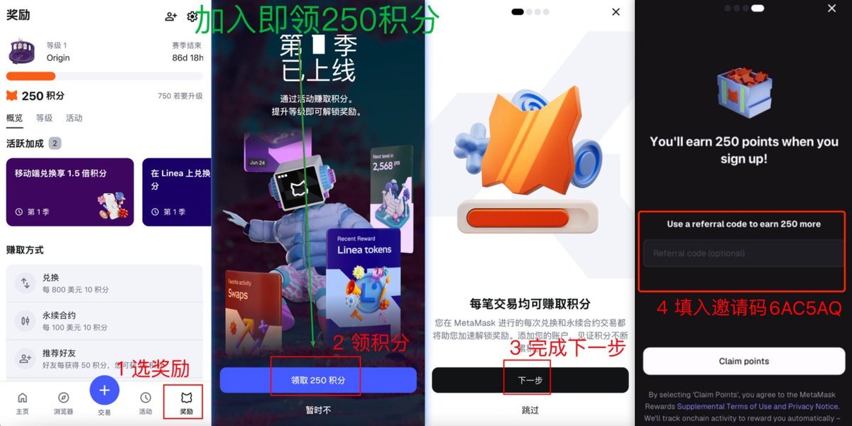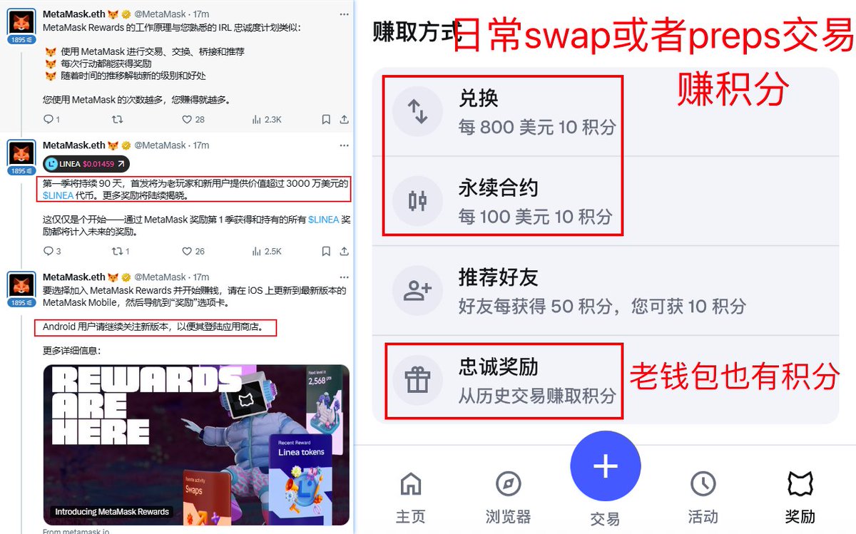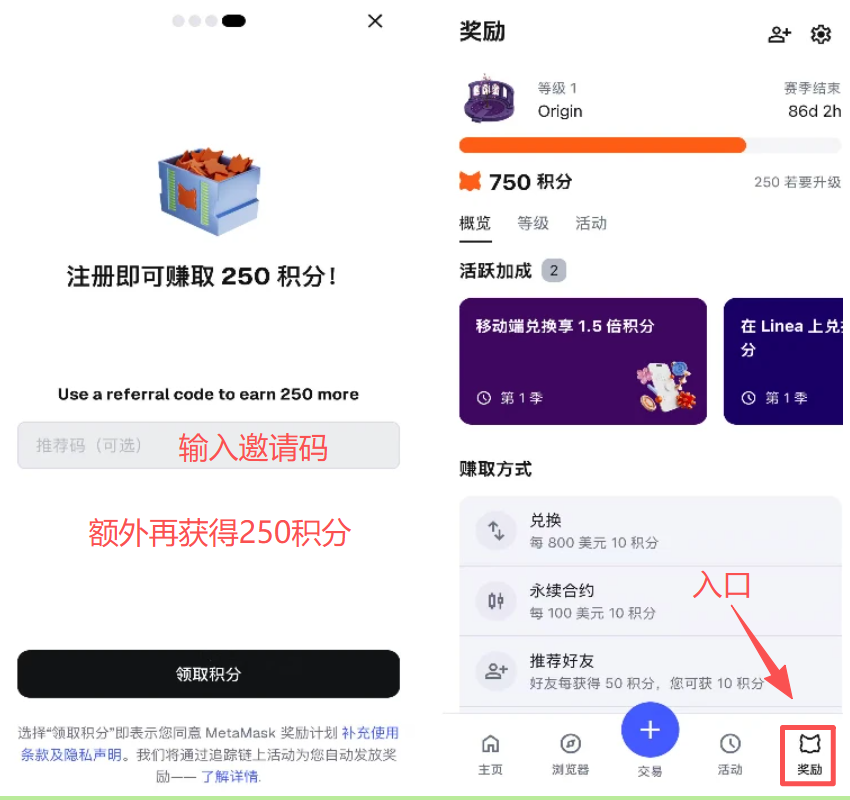 在 Metamask Swap,交易perp,拉新都能赚积分,具体规则: