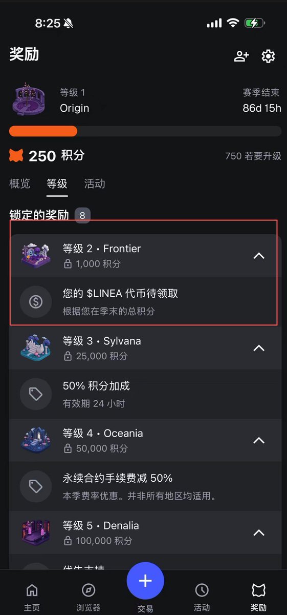 6️⃣解锁等级3后才有 $LINEA 奖励领取资格,50%积分加成可手动选择任何时间开启,有效期24h