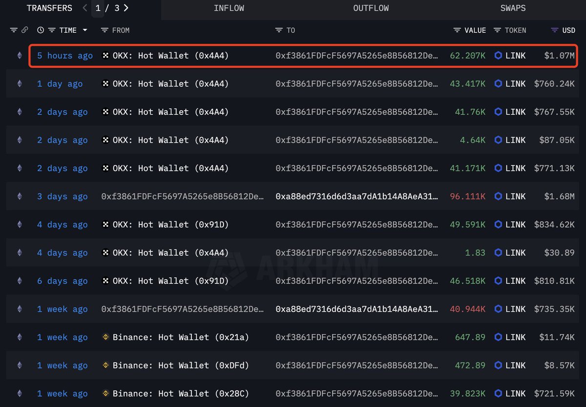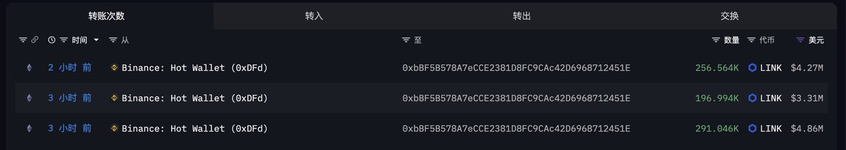 ▶︎ 地址 0xCC8…d7B03 在 10.11 收到 0xbc1…C6A2C 转移的 10 万枚 LINK,当时价值 200 万美元