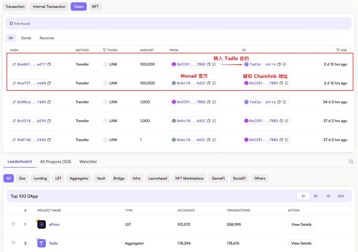 找做市商的时候发现一笔 10w 枚 $LINK 的大额交易,扒了下应该归属于 Chainlink 旗下的 DeFi 聚合协议 @tadle_com,看起来像是在为 Monad 上线主网并集成 Chainlink 做准备