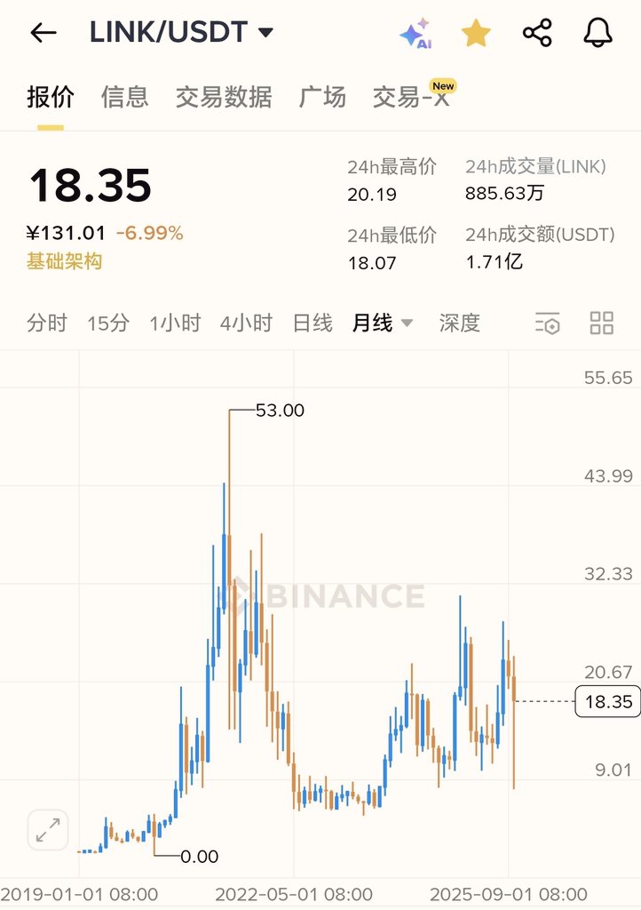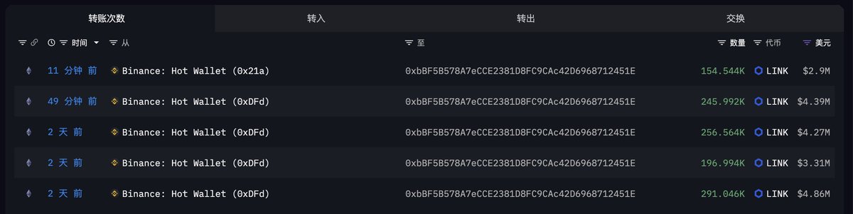 三天前他以均价 $18.13 囤积了 93.4 万枚 LINK(1694 万美元),前天下跌时 $17.5 充值进了交易所,若卖出将亏损 59.2 万美元;4 小时前他又从 #Binance 提出了 50.6 万枚 LINK(847 万美元),暂时无法判断是买回来的还是部分没有卖掉