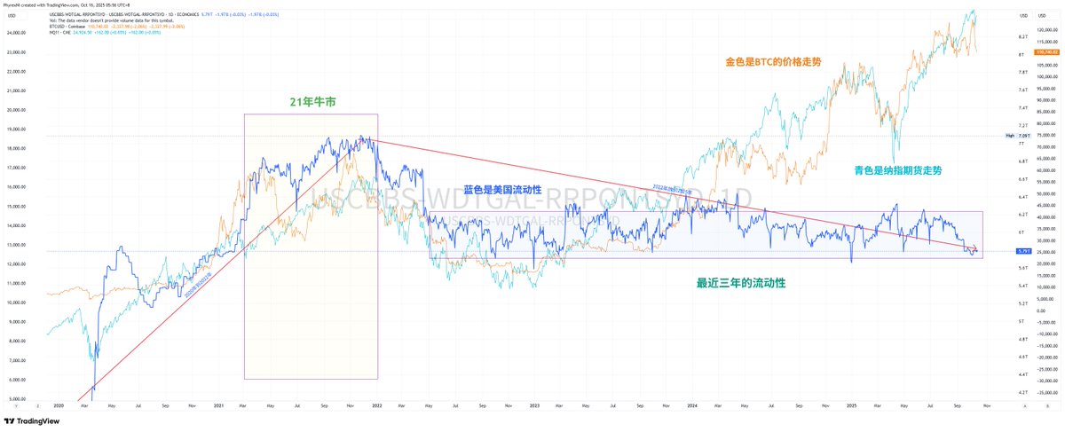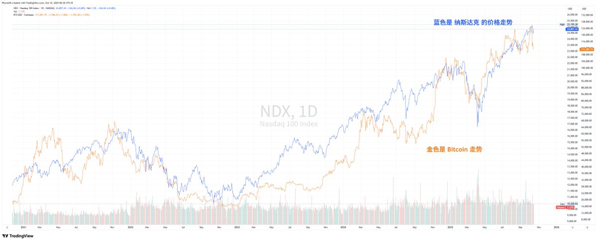 但我们换个思路来看好像 Bitcoin 和 纳斯达克指数与流动性没有直接的关系,在2022年流动性不足,纳指和BTC是在下跌,但在同样流动没有变化的2024年以后纳指和BTC都在上涨,尤其是2025年涨的更厉害。