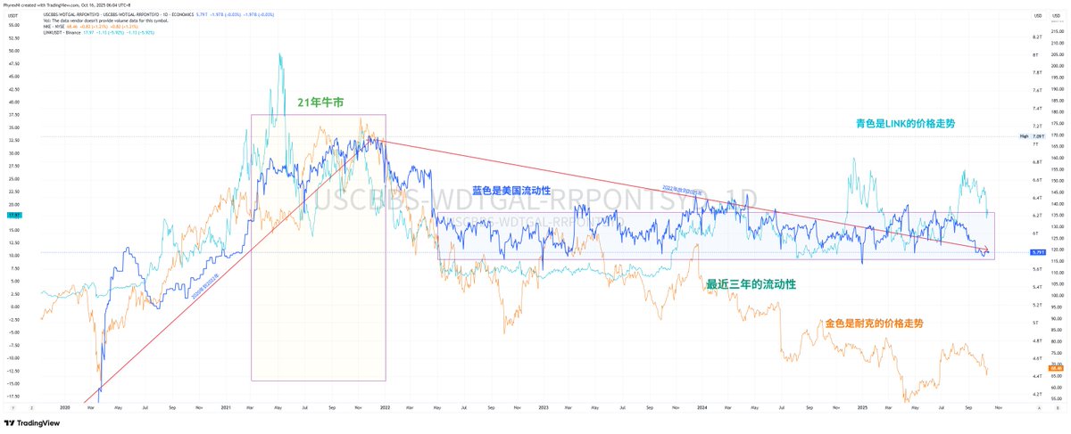 再换个思路,我标记了 Chainlink 和 耐克与流动性的关系,明显看到同样是加密货币和美股,LINK 是目前币圈最普及的预言机,也是排名最靠前的实用型的应用,而耐克就不用多说了,代表了潮流的品牌运动鞋,世界500强的企业。他们两个和流动性相比感觉会更加的依靠于流动性,流动性好,对他们来说是牛市,流动性不好,对他们来说就是熊市。