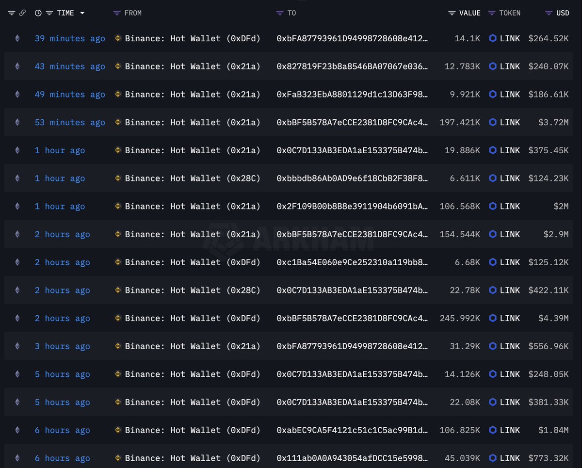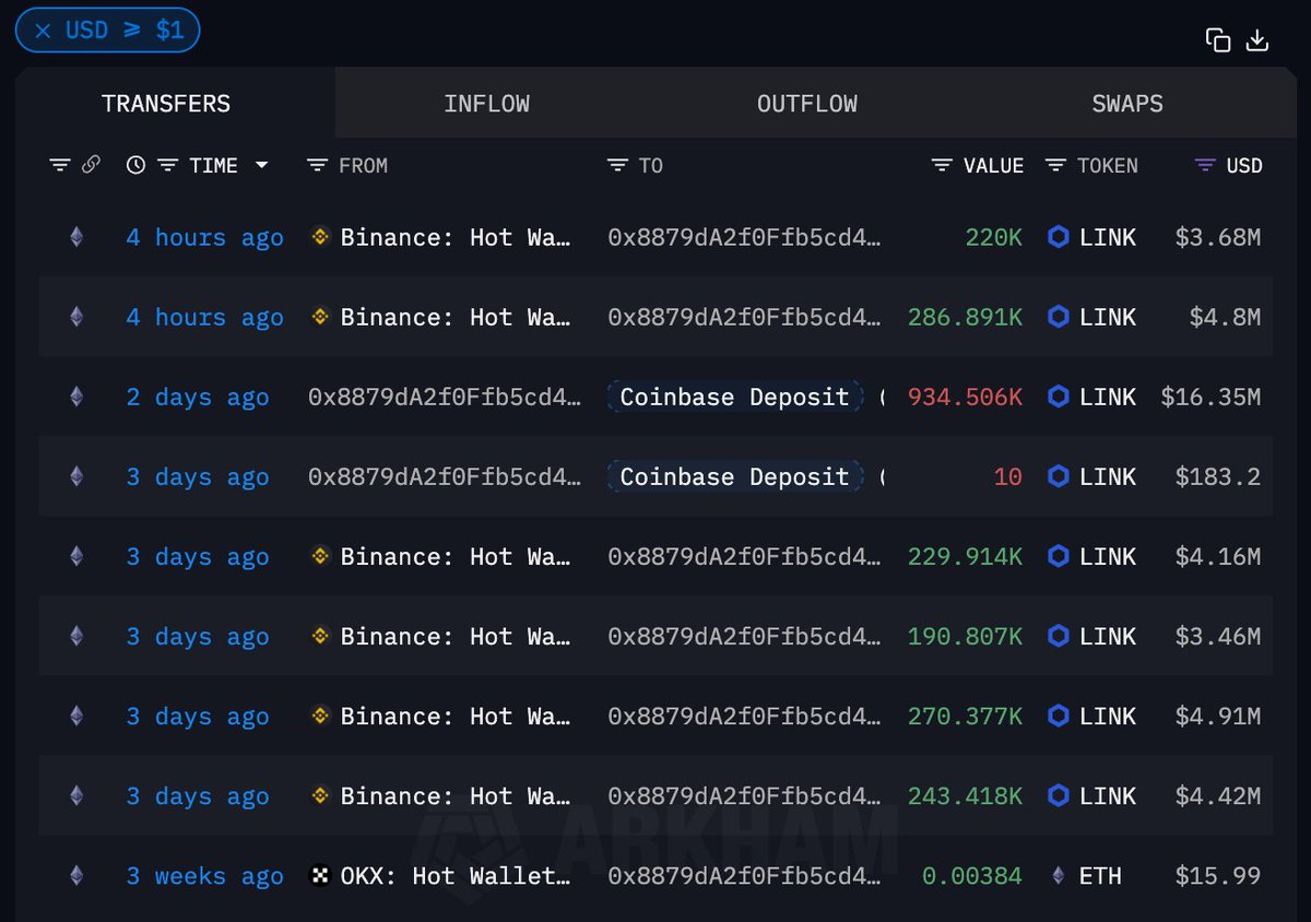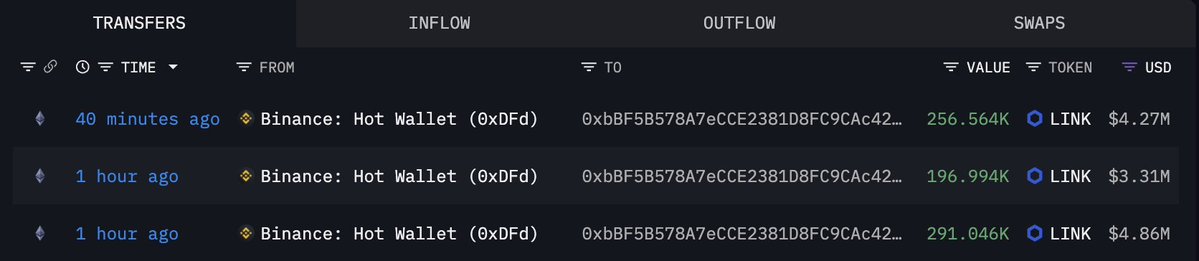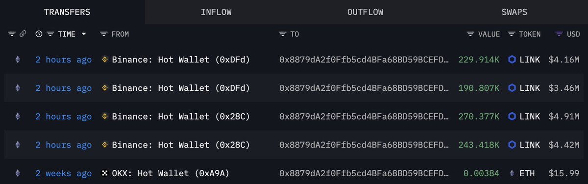 LINK 在今天上涨了 12% 后,在前天创建并从币安提出 LINK 的鲸鱼钱包,在过去 50 分钟里继续从币安提出了 40 万枚 LINK ($729 万)。