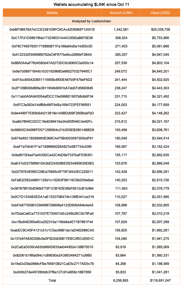 这两个钱包 (应该属于同一鲸鱼/机构),在最近 9 天时间里一共从币安提出了 261.7 万枚 LINK ($4672 万),均价 $17.8。
