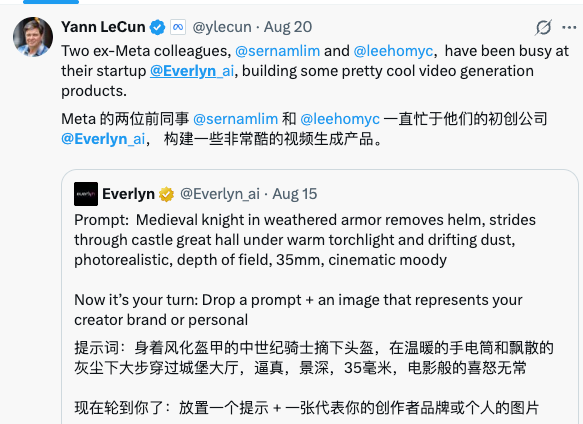 体验了一下 @Everlyn_ai Everlyn 做 ai视频。 做的挺牛逼。目前代币已经上了币安alpha,处于底部横盘阶段。 看了一下背景,确实很强,学术顾问是图灵奖获得者 Yann LeCun @ylecun 这在ai这块,算是非常强的背书了。 ceo Patrick Colangelo 是 Nesa 联合创始人兼CEO,此前是 arvard College Private Equity Group 总裁。他毕业于哈佛大学。 项目负责人 Sernam Lim 同时担任佛罗里达大学计算机科学系的副教授。 两个字,专业。 融资了1500万美金, 由 Mysten Labs 领投。 这个项目算是 Web3 的Sora 升级版 #Web3Sora 在ai视频这块,目前圈内好像还没有其他的竞品。 他的牛逼之处在于,生成视频的同时,会给用户奖励 $LYN 代币 形成一个经济循环。 $LYN 代币驱动整个网络,用户贡献计算资源、验证视频或参与生态,就能赚取代币,形成正向激励。 并且这一切都有链上证明,和来源追踪,避免了中心化风险。 关键是很多ai只有一个概念,没有真正好用的产品。 Everlyn通过简单的提示词公式:[主体] + [动作] + [场景] + [氛围] + [风格] 任何人都能快速上手,生成故事、广告或 meme。