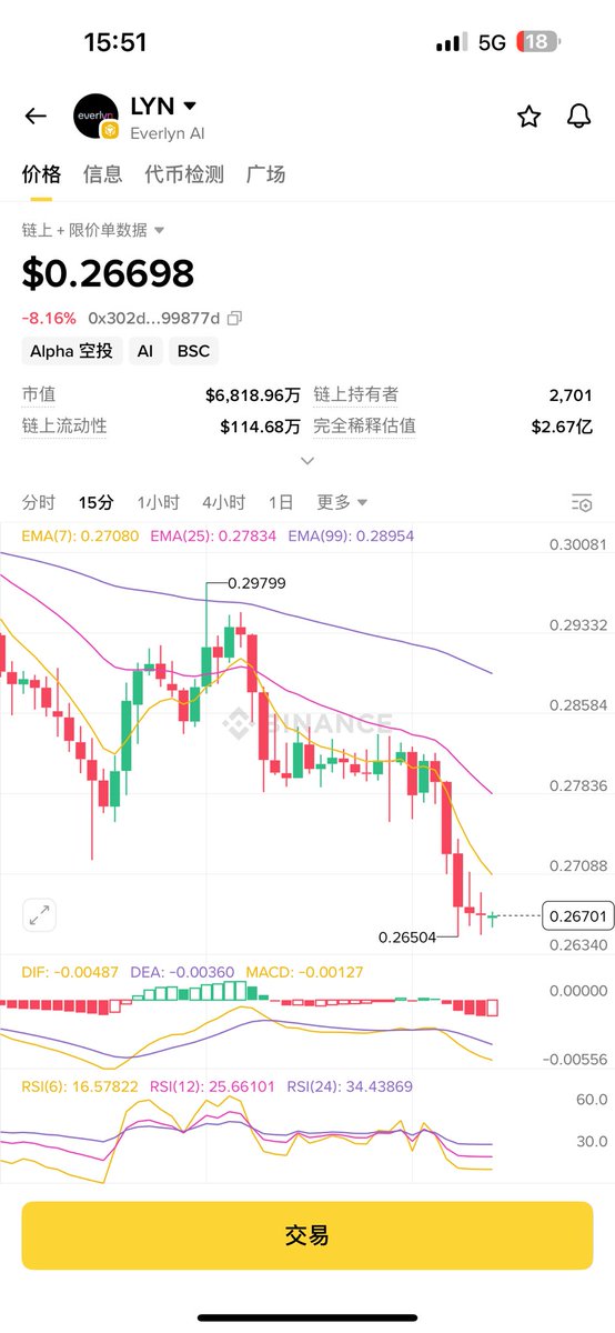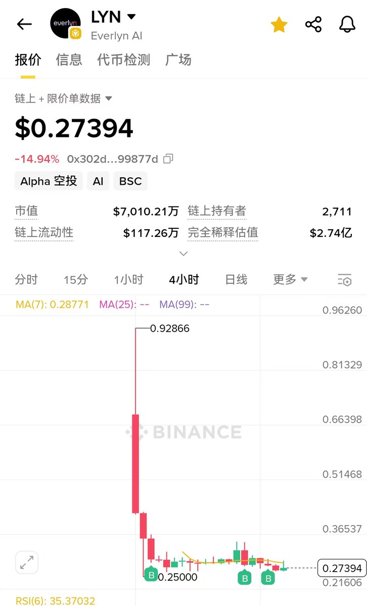 @yzilabs 孵化背书的 $LYN 目前已经跌至历史阶段的低点,此刻有反弹的现象出现。 这个位置也临近 0.25 的公募成本,目前已经上线了币安合约对。 近期热门赛道肯定是包括 AI赛道 的,其中表现最佳的标的应该是 $COAI ,从我 0.29 看到现在,最高也有 20 倍了。 而 @Everlyn_ai 也是属于 "币安 alpha + 币安合约 + 高融资" 的项目,作为首个 AI视频赛道的项目,当前位置的性价比还是蛮高的,上升空间大,止损空间小。