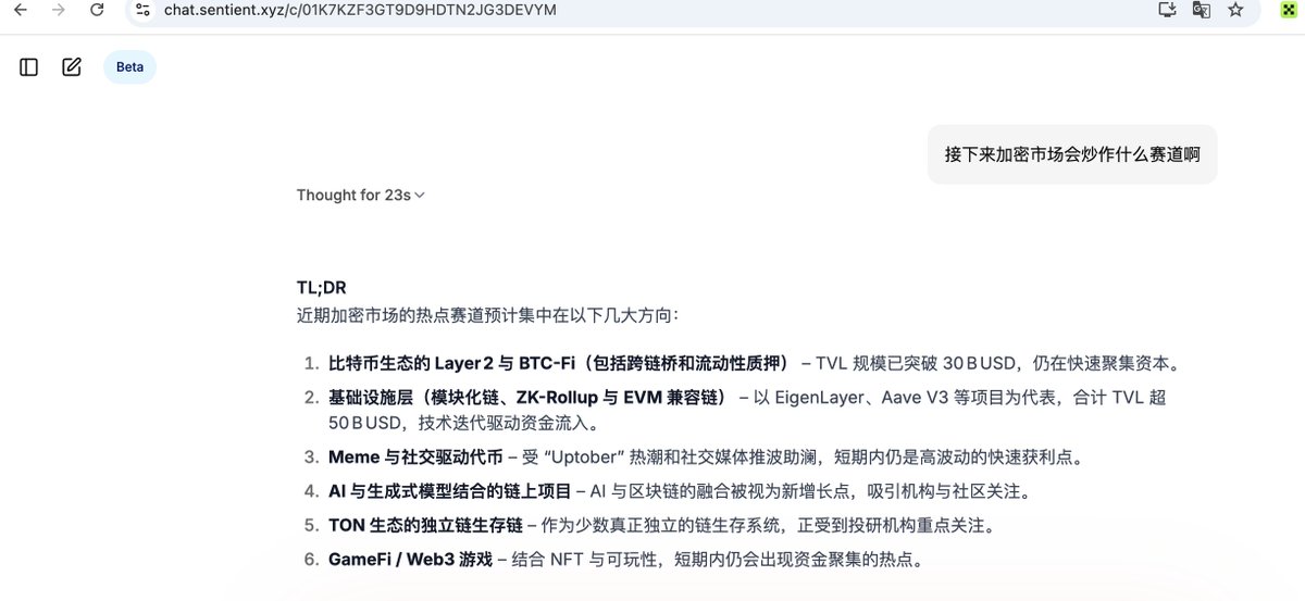 然后追问 @SentientAGI “接下来加密市场会炒作什么赛道啊”