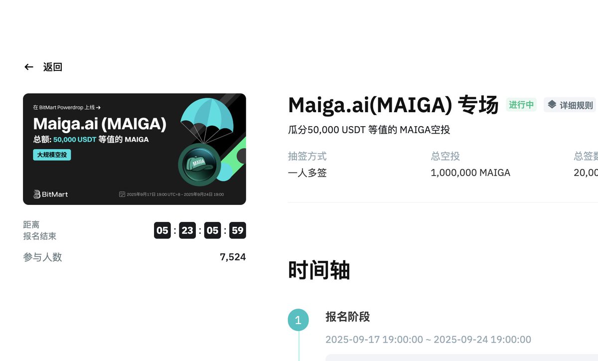 看到 $Maiga 上线币安Alpha,并且https://t.co/S0KrGA4awq(MAIGA)首发上线 BitMart! 并且上线了限时瓜分 50,000 USDT 等值 MAIGA 的活动! https://t.co/S0KrGA4awq 旨在通过"Proof of Trading"代币模型和去中心化AI交易代理,类似Virtual 的Ai agent Launchpad(在bsc上)! ➤ 简单说下这个活动 ① 报名 & 获取签数(9/17 – 9/24) * 交易:每满 500 USDT 现货 = 1 签 * 邀请:好友注册并充值 ≥10 USDT,双方各得 1 签 * VIP:按等级分配签数 ⚠️ 系统取「交易签数」和「VIP签数」中较高值 ② 清算抽签(9/24 19:00 – 22:00) * 系统随机抽取,签数越多,中签概率越大 ③ 结果公布(9/24 22:00) * 中签用户 24 小时内收到 MAIGA 空投 ➟ 传送门:https://t.co/M3KrH4IWk8