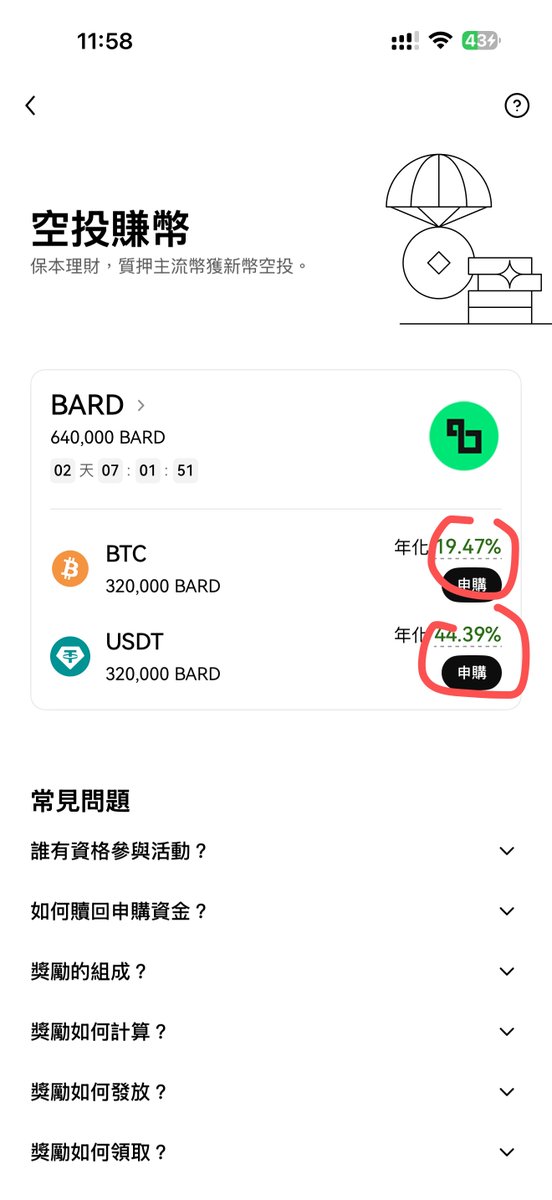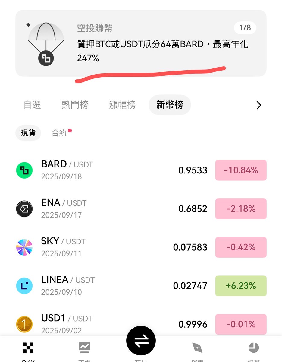 @okx 交易所主页上,找到这个空投赚币活动,可以撸 $BARD 奖励,相当于白嫖了: BTC:限额 1 BTC,年化19.47%。 USDT:限额 10000u,年化44.39% 1wu每天可撸 11 个 $BARD,每个人最高可获得1500 $BARD 。