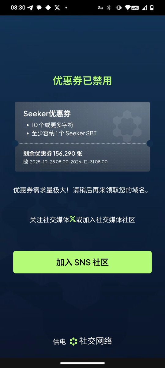 2.域名项目 @sns 为SEEKE用户带来免费域名,每个持有灵魂绑定 Seeker Genesis Token持有者,可以在sns的dAPP中免费领取一个10以上字符的.sol 域名。目前领取页面因领取人员太多暂时关闭了,回头等我研究明白了会更新到SEEKER中文站点,等我再探再报。