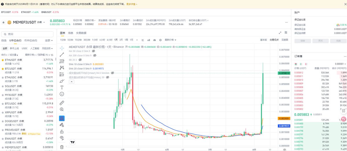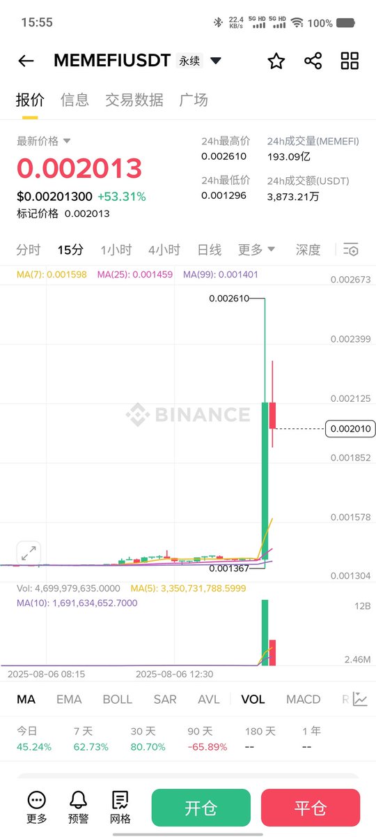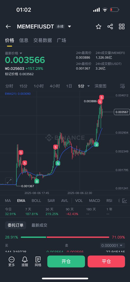 先说一个开心点的, $memefi 上 @binance 合约的时候随手追了一点,逻辑是sui生态很疯狂,并且市值也不高,在18-20M之间,看到这个币的时候我第一反应就是会不会走$X的剧本,因为那天 $X