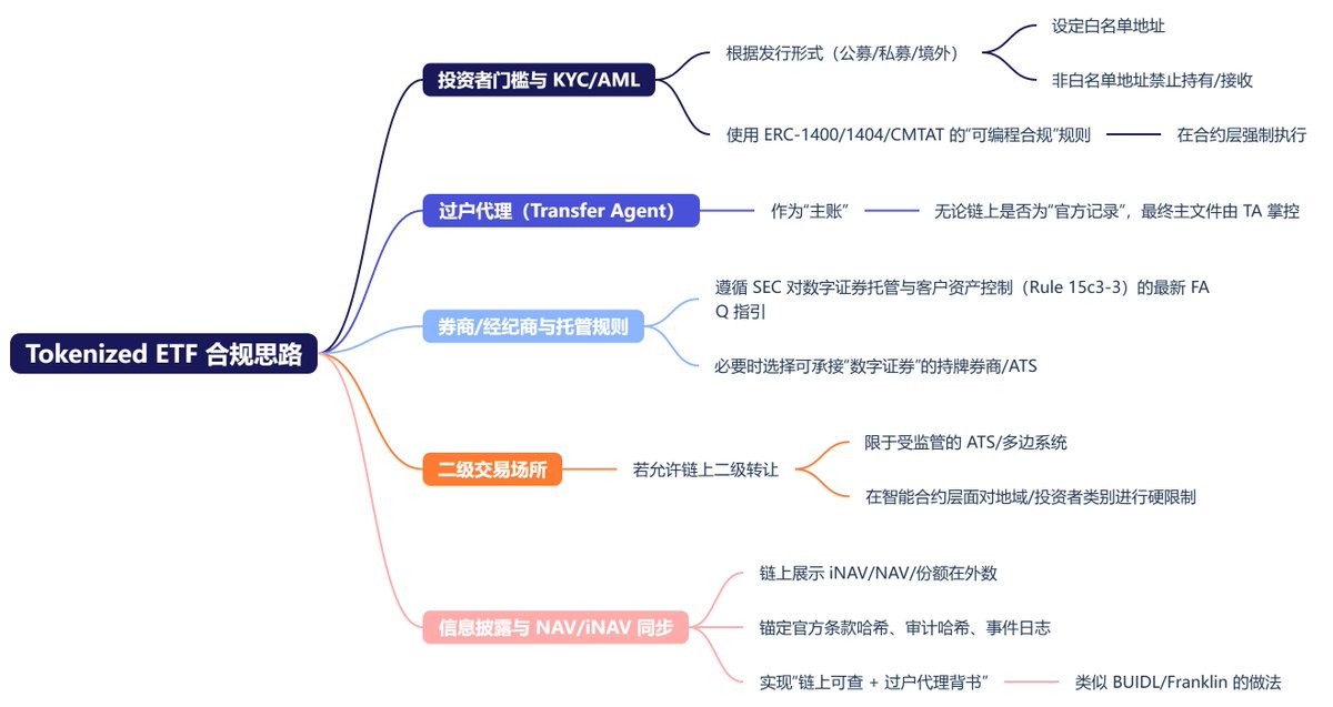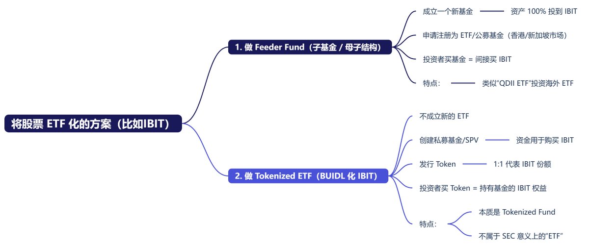 第二种是 Tokenized ETF 的方式,这种方式更加的复杂,在合规上有非常强的要求,贝莱德的 BUIDL 就是采用这样的方式。我用简单点的方式来说: