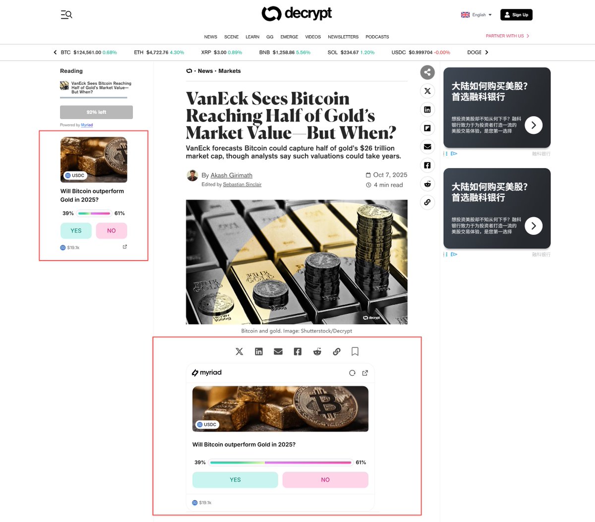 🔹场景更加日常化,上预测市场直接整合到媒体/社交内容(Decrypt文章、X的帖子等),用户可在内容上下文中无缝预测;