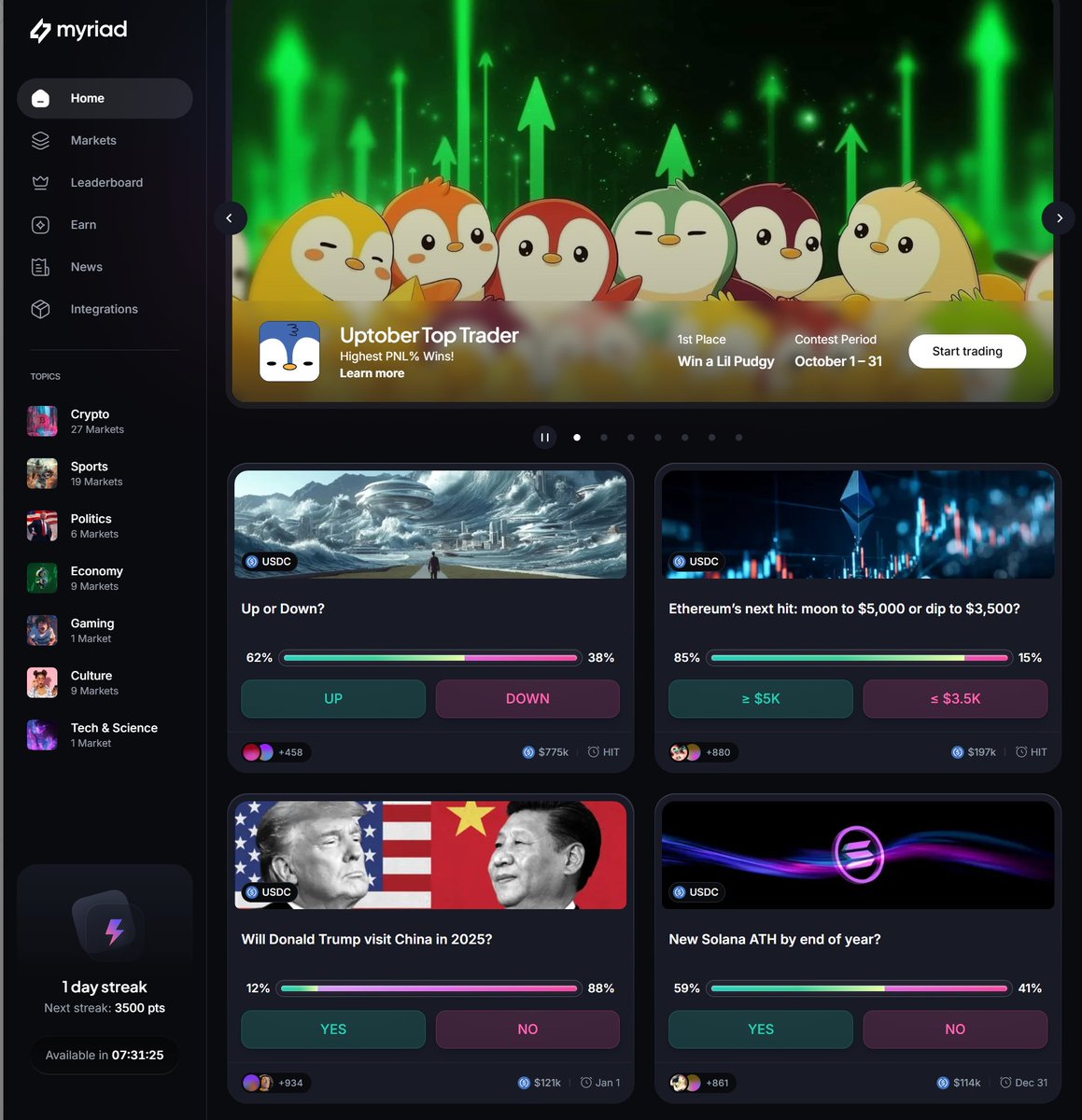Myriad Markets由Decrypt和Rug Radio母公司DASTAN打造,通过浏览器扩展将链上预测市场嵌入媒体内容,用户可以通过USDC或者积分在预测市场或者新闻、社交媒体中直接一键下单。覆盖范围包括加密货币、政治、体育、文化等。
