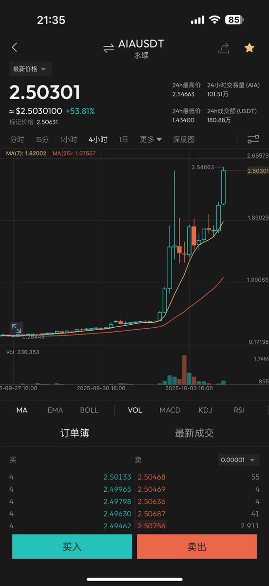 这个 $AIA 的庄好强,自选里唯一绿的代币了。 能从$0.5拉到$3.8,再砸回$0.6,现在又拉上$1.5. 想起了近期的妖币 $COAI 和 $MYX ,这些代币都有一个共同点,同时上了币安Alpha和合约,似乎这种配置,很容易拉盘操控出妖币。