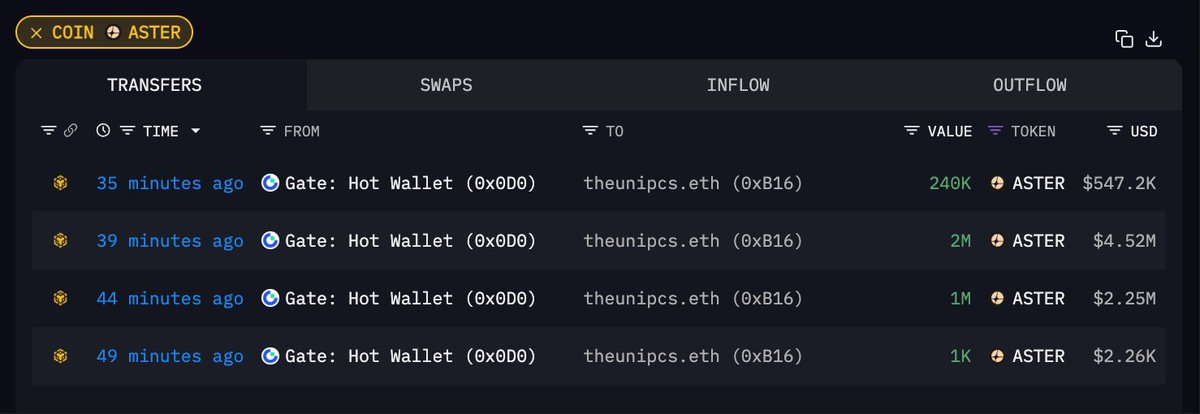 过去 1 小时地址 theunipcs.eth 从 #Gate 提出 324.1 万枚 ASTER,价值 731.9 万美元,提出价格 $2.25(实际成本不可知)