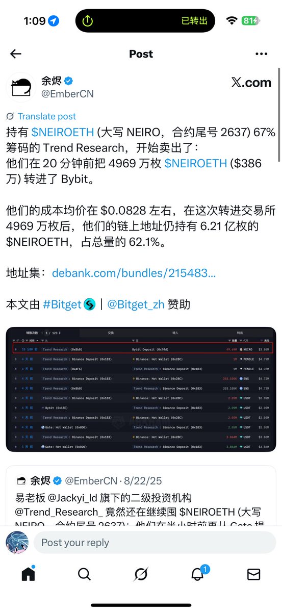 既 $ENS 和 $PENDLE 后,了得资本关联机构 Trend Research(@Trend_Research_) 疑似正在减仓 $NEIRO