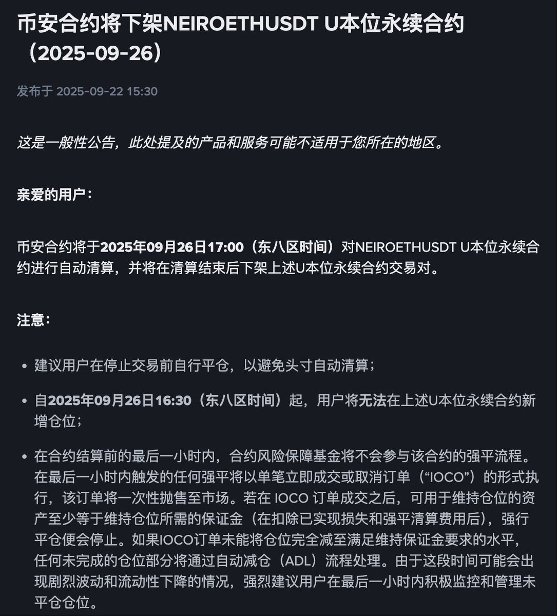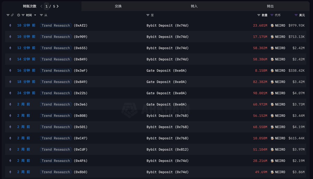 这有意思哈,这是事先知道要下架所以把币转进交易所,还是因为币转进了交易所而被下架呢? ◎9 月 4 号 Trend Research 把 32.4% 的 NEIROETH (3.247 亿枚,价值 $2200 万) 转进交易所后,当天 Bybit 宣布下架 NEIROETH 合约; ◎昨天 (9/21) Trend Research 把另外 34.6% 的 NEIROETH (3.46 亿枚,价值 $1436 万) 转进交易所后,今天 Binance 宣布下架 NEIROETH 合约。