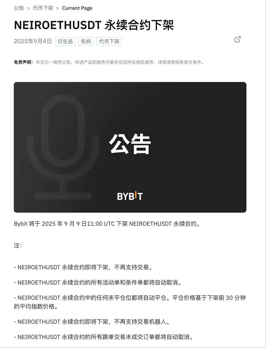 Bybit 刚才发布了下架 $NEIROETH 永续合约的公告,Trend Research 今天上午这 1.29 亿枚 $NEIROETH ($1003 万) 出货应该就是因为这个原因吧。