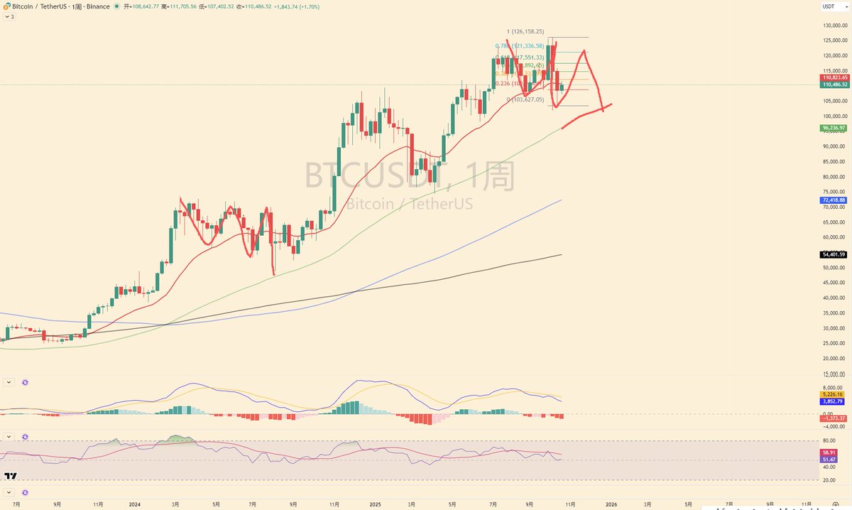 一,认为政府开门受影响比较大的币种应该是一揽子ETF币种,用 $XRP 举例,他的斐波那契压力位与结构压力位都在2.75左右,突破此为止则反转的概率大于反弹。 二,币圈的逻辑也一直在向着美股靠拢;就是看大象飞舞,而小币却越死越透。 过去我们玩山寨,会经常埋伏低市值的小币,搏一个大的收益倍数,但是现在这种玩法在无限乱发小币的市场状态下已经难度越来越高了,除了个别小币妖庄以及链上会偶尔给个惊喜之外,绝大对数币种上线即派发,奔着归零去,资金都向着确定性高的大币种靠拢。 越往后,这种以小博大的玩法对于专业素质的要求就会越来越高;当然,市场上的水量,也决定当前市场的难度,当财政部/联储向市场放入更多的水量,市场的难度会相对的降低一些,那个时候才是大多数人的机会。 逻辑是:当水量充足,市场上出现赚钱效应,才会有正向循环,有正向循环,市场才能信心充足,狗庄和散户才会有信心去BD小币种;毕竟,你们要知道,市场环境不好的时候,不只是杀散户祭天,狗庄们也是大庄吃小庄,前几天你们都看到了,好多小庄们都给玩破防了。 三, $BTC 大饼的上周的周线收的还是比较强势的,1年前我都说过,大饼的整体逻辑已经改变,4年周期不再适用,波动率降低,无限接近于美股的头部股票的走法是大饼今后的样子。 2025年2-4月那波大跌就可以看的出来,大饼强势近乎于美股指数,且强于女大 $NVDA 。 目前从小级别上来看,大饼从103528并没有向上走出推动形态,预判可能非常接近2024年3-8月的走法。 还是重复过无数次的话:调整,要么给时间,要么给空间。测量一下,大饼这种从最高点下来的跌幅都没有超过20%,而本轮最大级别的上升趋势中的回撤极限是30%左右。 绿线,是牛熊分界区间中的一条线。 碎碎念: 今天起床神清气爽,感觉终于从10月11号那天开始对币圈的生理性恶心中缓过来了。 这段时间强制自己睡眠、运动、吃保健品,感觉血压终于降下来了,于是,我把枪又埋起来了。