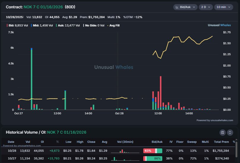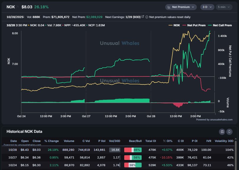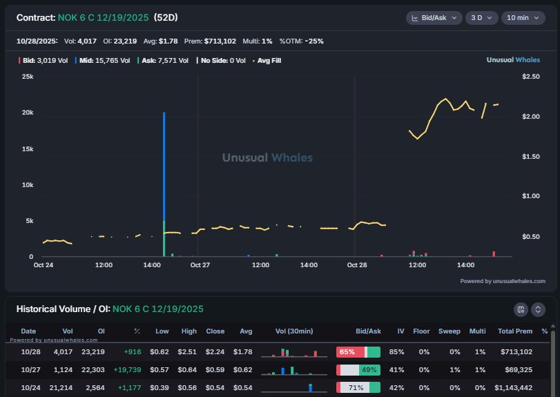 今天早些时候,在 $NVDA 的 GPU 技术大会上,首席执行官黄仁勋 (Jensen Huang) 宣布与诺基亚 $NOK 建立战略合作伙伴关系,其中包括 10 亿美元的投资。 交易者提前知道吗?或许。 今天之前的前两个交易日期权活动略高于平均水平