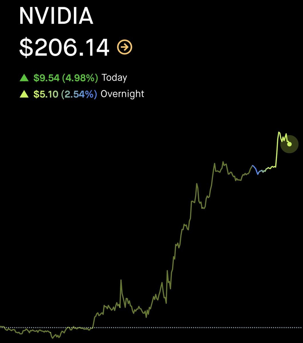 突发新闻:Nvidia($NVDA)历史上首次正式突破 200 美元/股。 现在距离成为第一家市值达到 5 万亿美元的公司还有 3%。