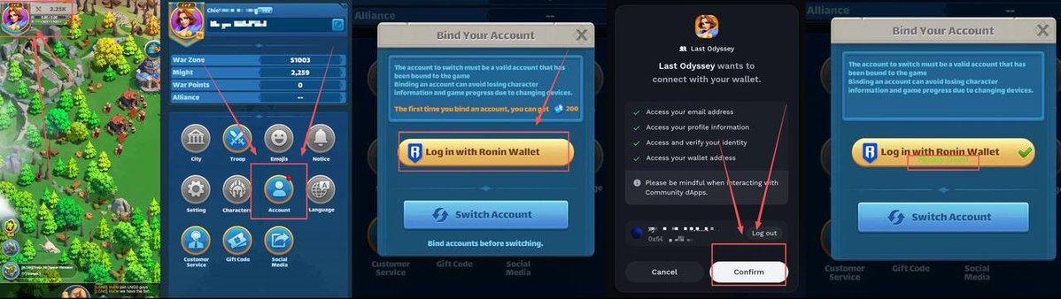 点左上角头像 → Account → Login with Ronin Waypoint → 登录钱包 → Confirm 完成绑定。