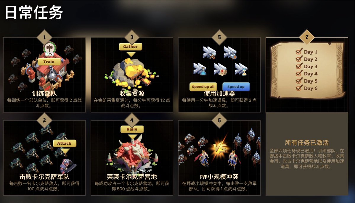 每一天任务不一样,第七天是爆发日。前六天稳稳刷,D7 集中用加速、训练、采集一起爆发,AP 冲榜性价比最高。