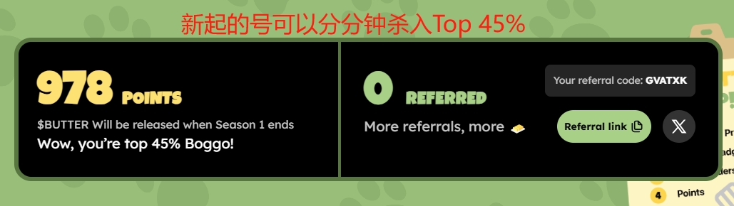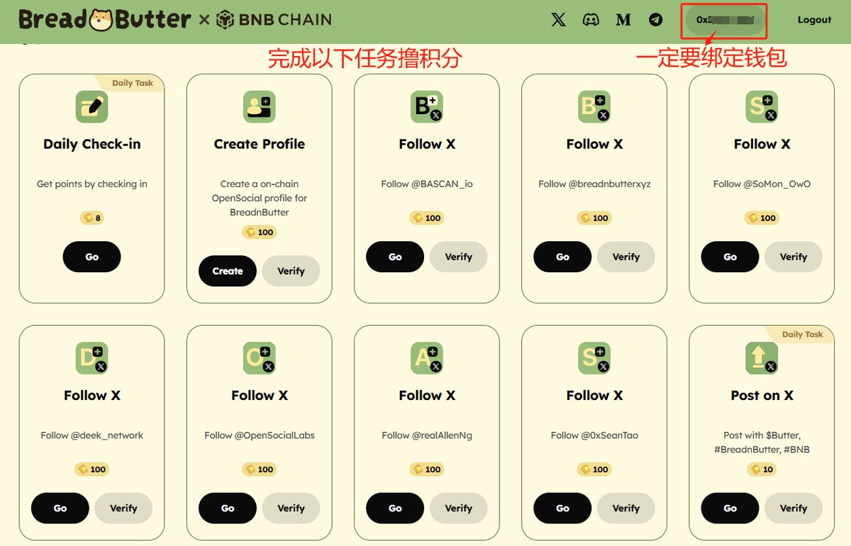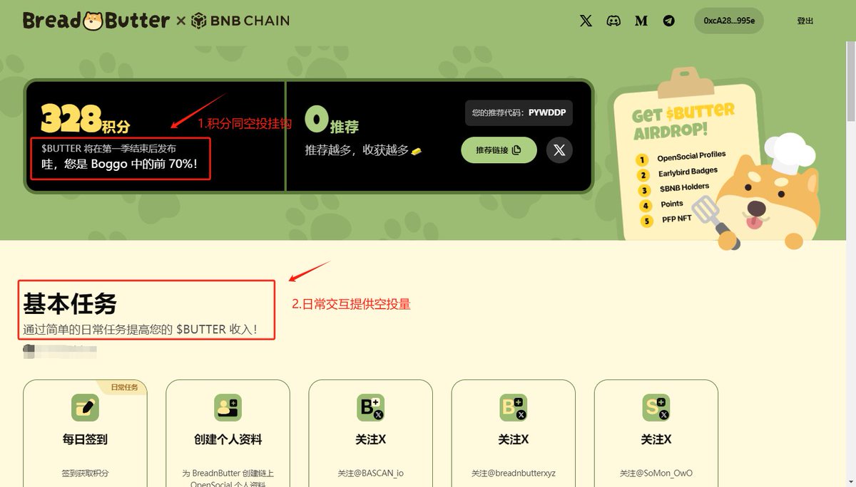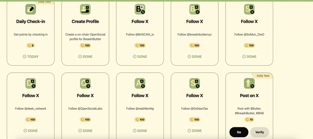 2.签到 + 创建个人资料 + 完成社交任务(需要真实关注但秒过,建议不要一次性关注完,免得封推)+ 推名字加“Butter ”,积分同空投量挂钩。