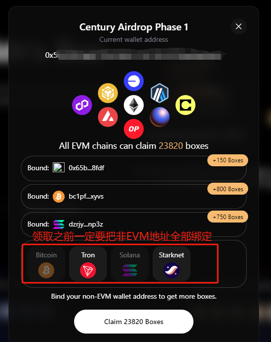 ④领之前把能绑的地址全部绑定,包括非EVM地址(BTC、Tron、Sol、Stark)