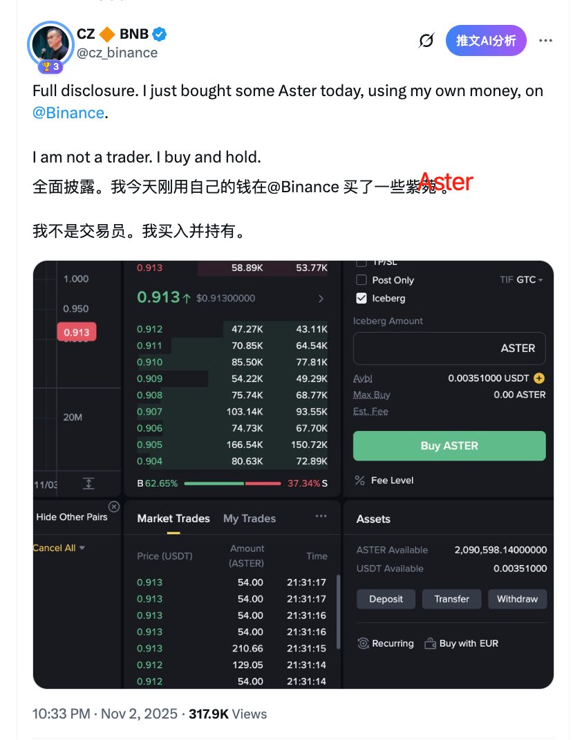 Aster第一车头+奶王CZ @cz_binance上线!